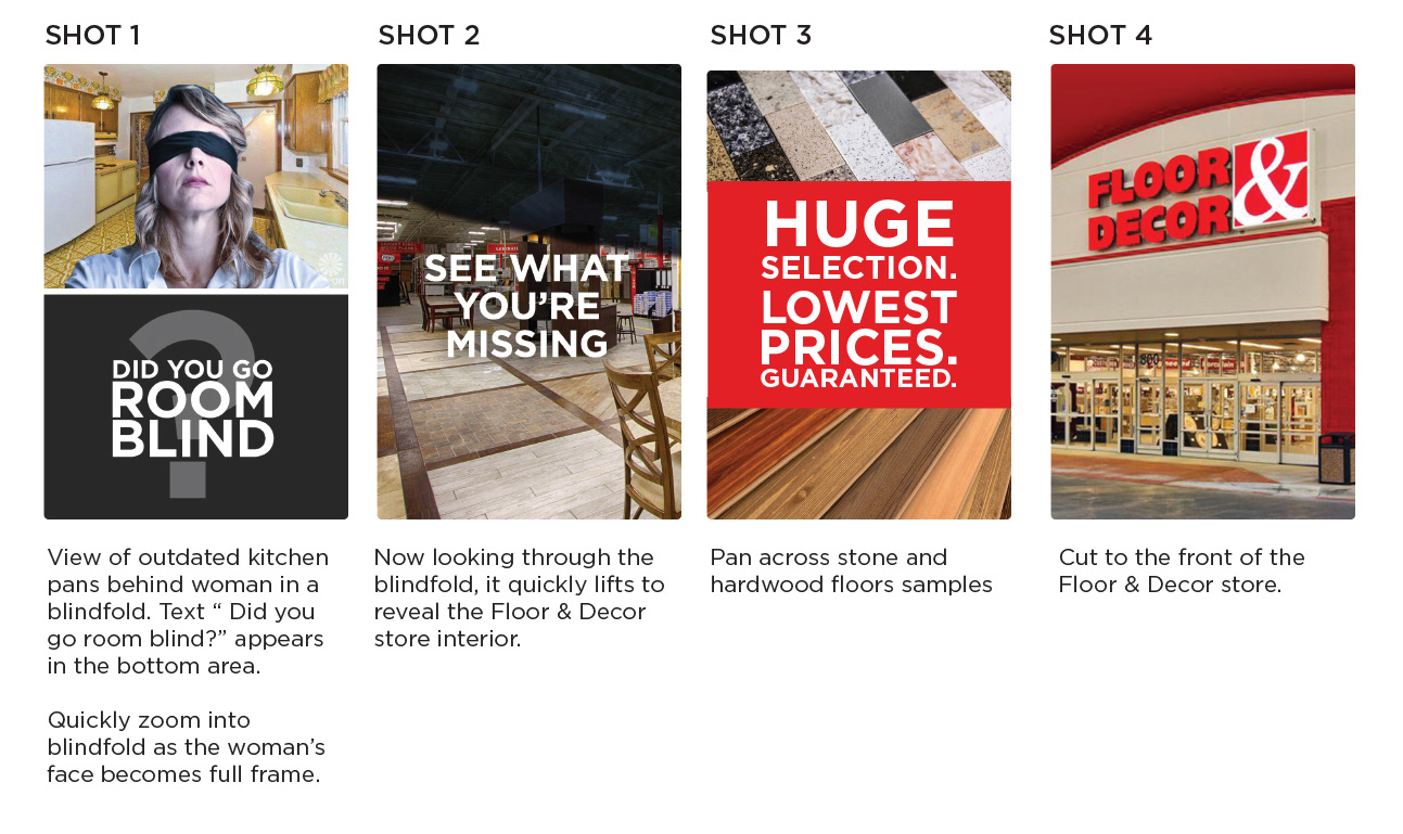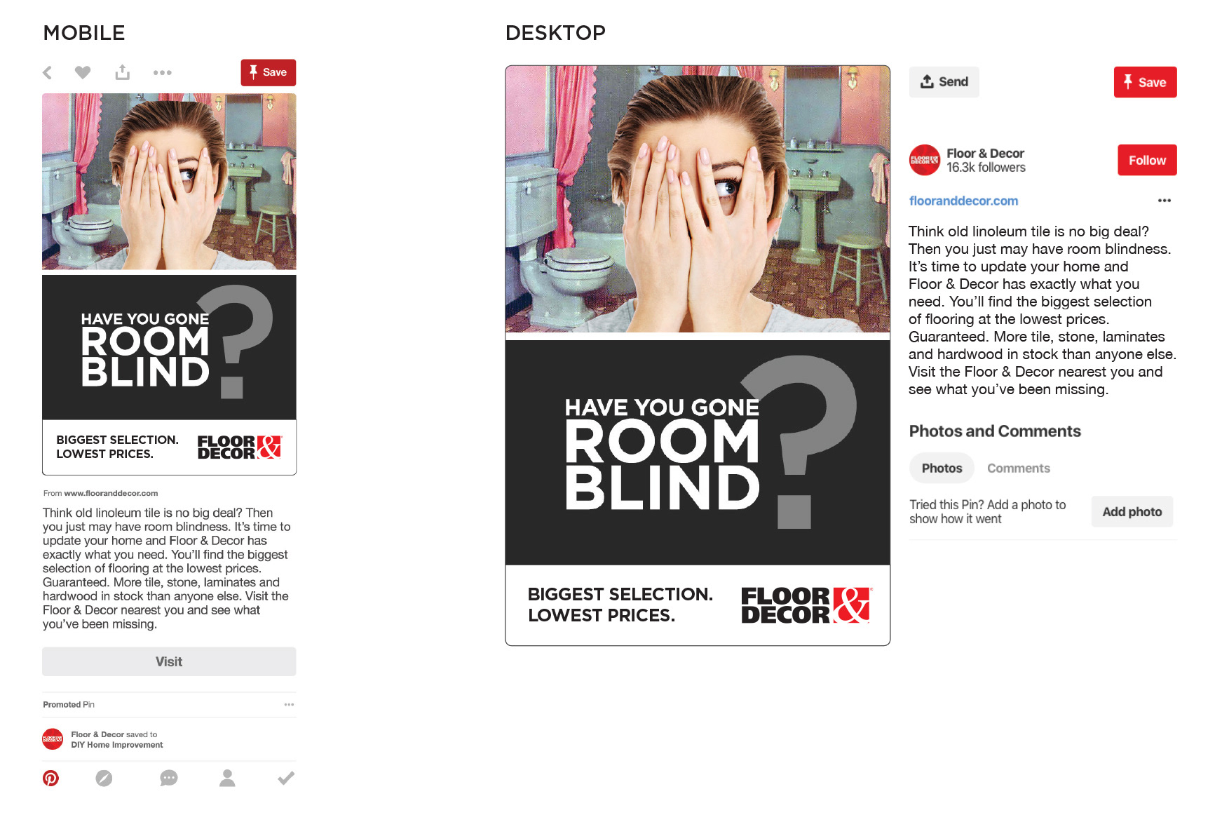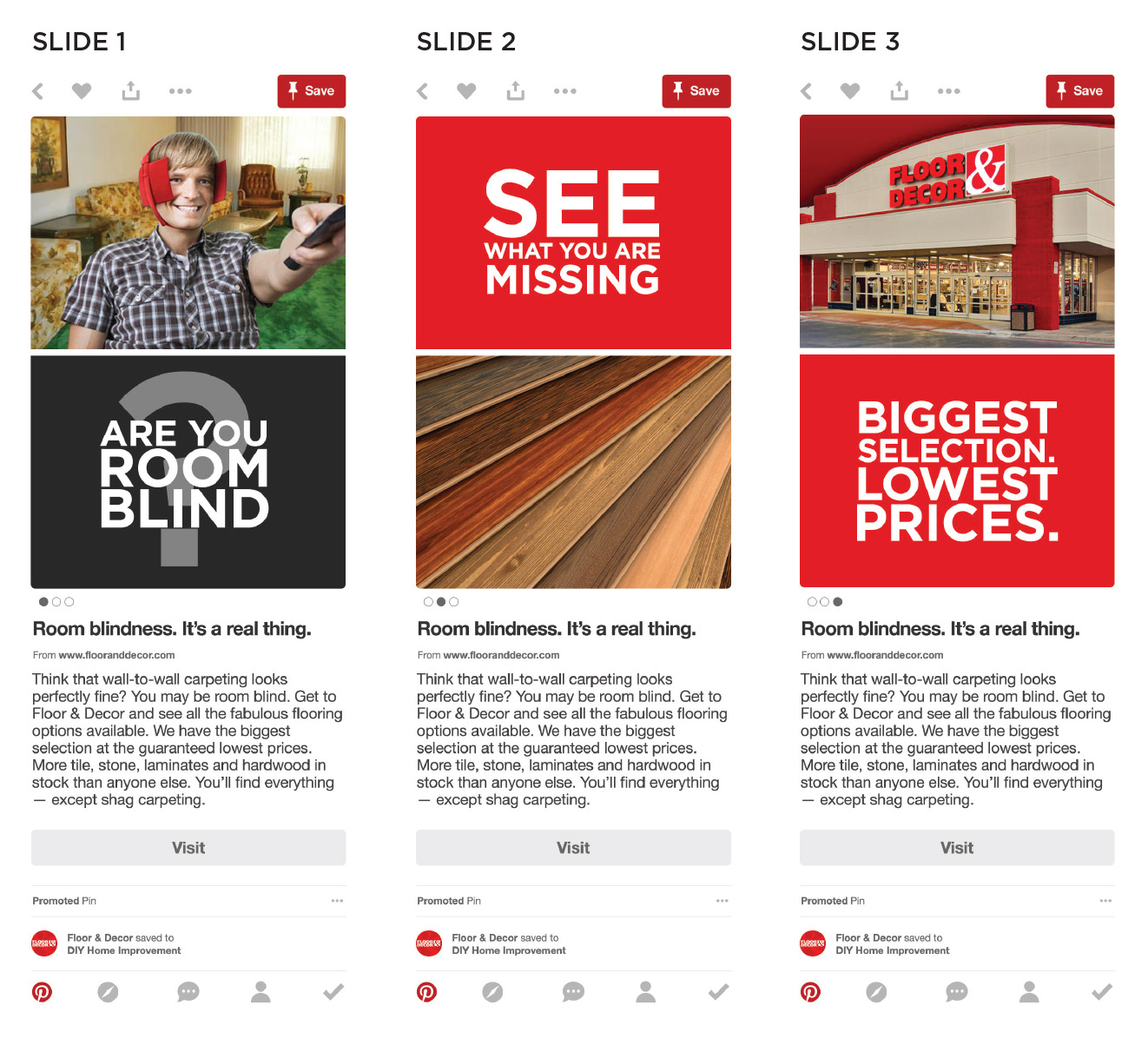 Pinterest video, carousel and static ad concepts for Floor & Decor by Rosann Bartle, Eric Kauppila and Steve Steger. Design by Eric Kauppila and copy by Steve Steger.